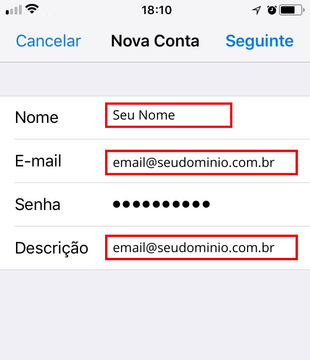 - Endereço de e-mail completo (ex.: nome@seudominio.com)